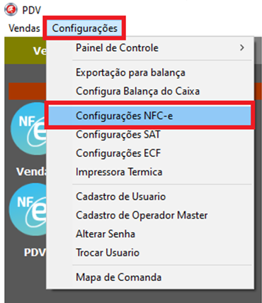 No MENU> Configurações> Configurações da NFC-e