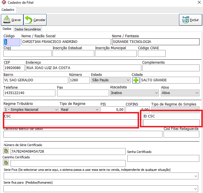 preencha o Cód de Segurança no Campo “CSC” e o ID Cód Segurança no campo “ ID CSC” (obs: verificar se não tem espaço nos campos)