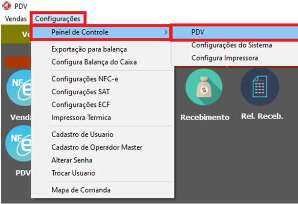 Acesse o MENU Configurações >Painel de Controle> PDV