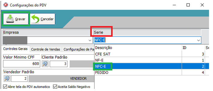 Nas configurações do PDV, no campo “SERIE” Seleciona a opção NFC-e e depois “Gravar”