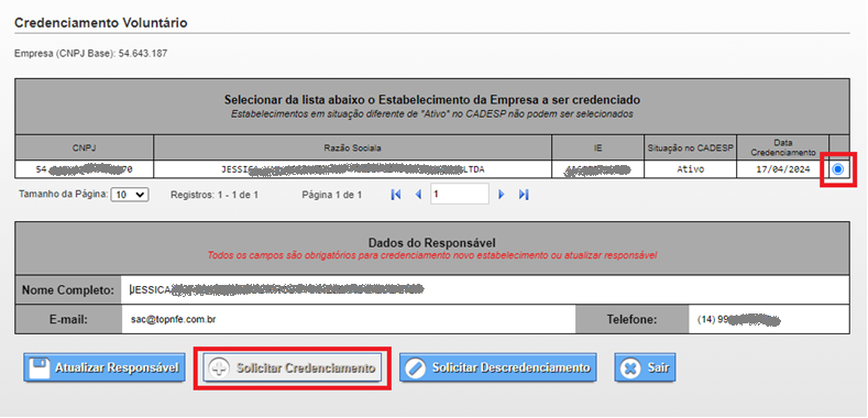 4-Na tela de Credenciamento, Selecione a empresa e preencha os dados do responsável pela empresa